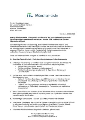 Antrag MüLi – Rechtsklarheit zur Einstellung SEM im Münchner Norden Redaktion München-Liste mit 4 Anträgen zum Ende der SEM – Sofortige Rechtsklarheit gefordert – Kein zweites Freiham!